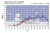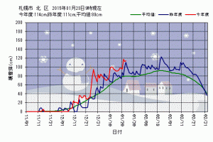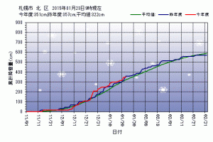 出品担当O嬢の暮らす北区をみますと累積積雪量は平年並みですが、右側の積雪深カーブをみますとドカドカ降っているようです。